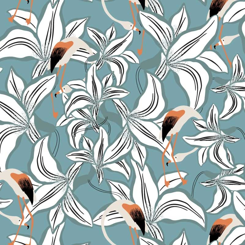 Un motif tout en délicatesse et intemporel qui mêle les Flamands roses aux végétaux.