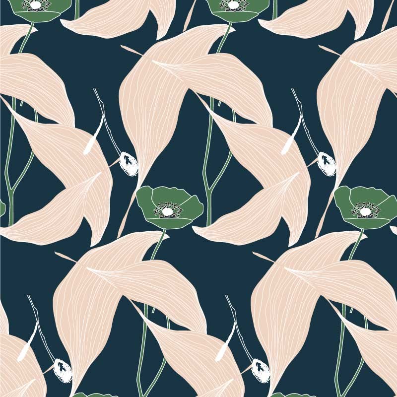 Un motif floral aux couleurs vert et rose sur fond marine.