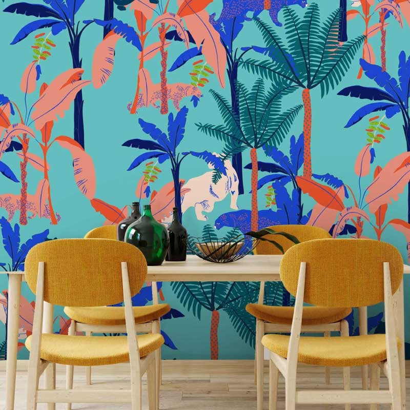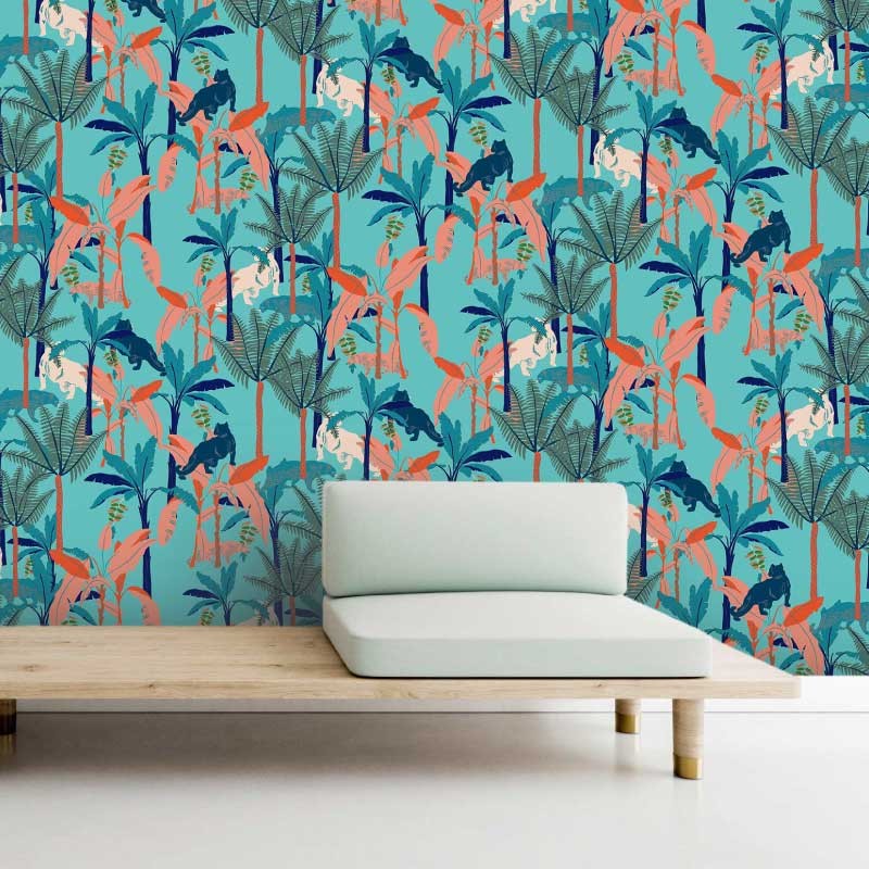 Un motif contemporain qui mêle de végétal aux panthères. Ici en version colorée turquoise, bleus et rose orangé.