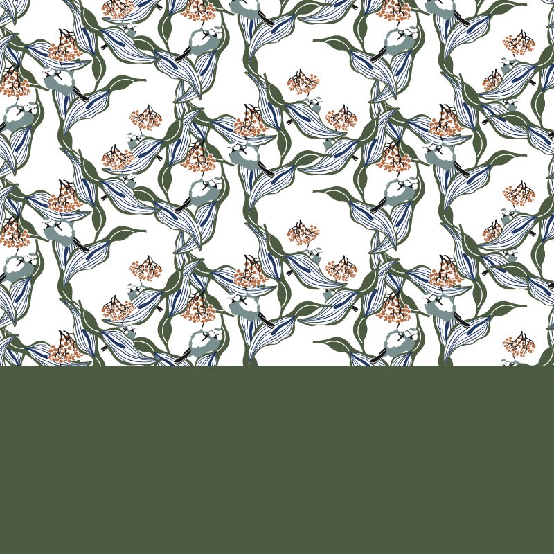 Un motif délicat aux couleurs douces qui met en avant les Mésanges et leurs positions improbables dans les feuillages.